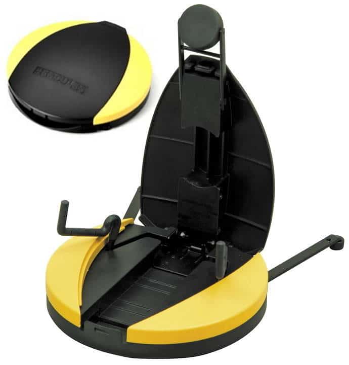 Small enough to slip into the pocket of a gig bag. Takes up less space than a traditional stand with