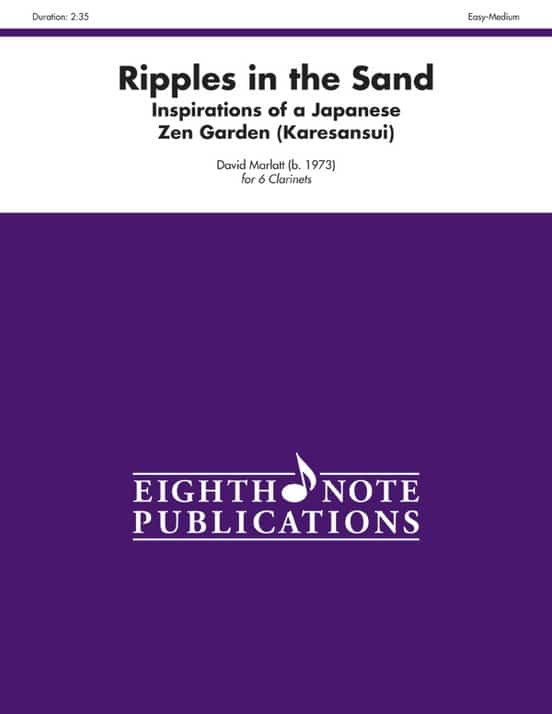 A karesansui is a Japanese rock garden which is an enclosed shallow sandbox containing sand, gravel, and rocks. The main elements are rocks and sand, with the sea symbolized not by water but by sand raked in patterns that suggest rippling water. This short work, for 6 clarinets and optional percussion, is peaceful, reflective and accessible to audiences. The major pentatonic scale is used as the basis for this composition which creates an interesting texture and evokes the sound of an ancient Japanese folk song.